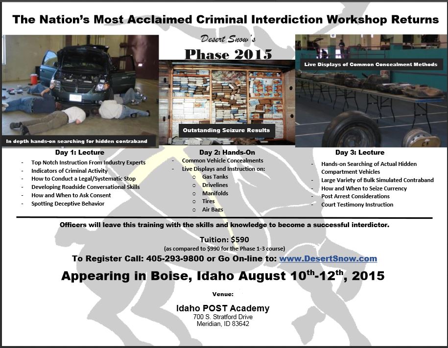 We are a leader in the field and have a reputation second to none, he insisted. Desert Snow has trained thousands of officers throughout the United States and Canada on how to successfully and professionally find major smugglers, terrorist [sic], child abductors and other major criminals. Our success stories and results speak for themselves.