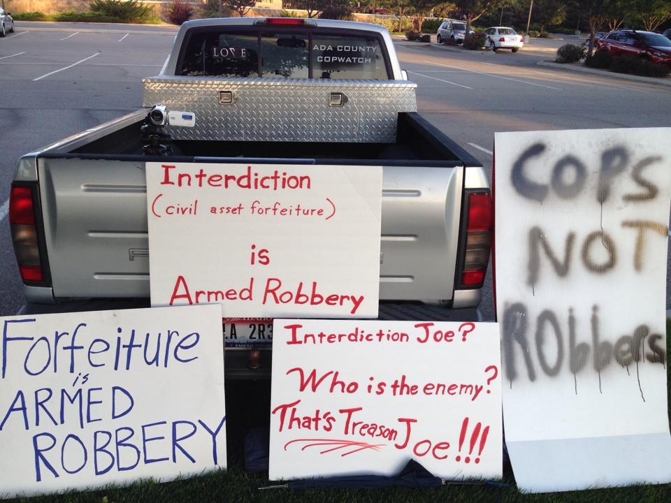 Joe David, a former California Highway Patrol officer, has made a considerable fortune by teaching police officers how to steal under the color of “law” through his “Desert Snow” consulting firm. When he arrived in Meridian, Idaho for a two-day “asset forfeiture” seminar on August 10, he probably didn't expect to be greeted by protesters. It is to his credit that he took advantage of the opportunity to speak with them, especially in light of the fact that the conversation couldn't have been a pleasant one for him.