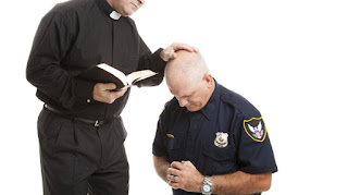 Cop-worship Sunday is becoming a common observance at American Christian churches -- particularly Republican-leaning Evangelical congregations, whose communicants are especially receptive to the oft-repeated and patently false idea that we are witnessing a "War on Cops." Pastor Dennis dutifully retailed that claim, urging his congregation to Pray for a hedge of protection around their vehicles, that angels will guard and shield them from danger.