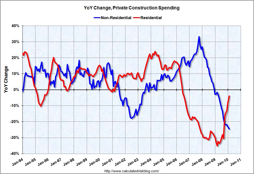 Private residential construction spending has turned down again over the last few months. I expect some growth in residential spending in 2010, but the increases will probably be sluggish until the large overhang of existing inventory is reduced.
