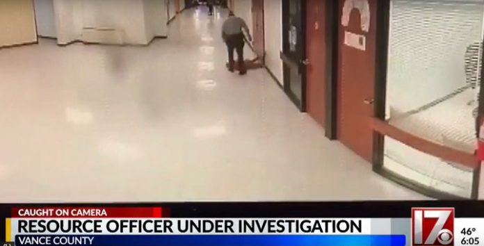 A school resource officer the euphemism for an armed government worker embedded in a government school has been caught on video Hut! Hut! Hutting! an 11-year-old kid inVance County, North Carolina.